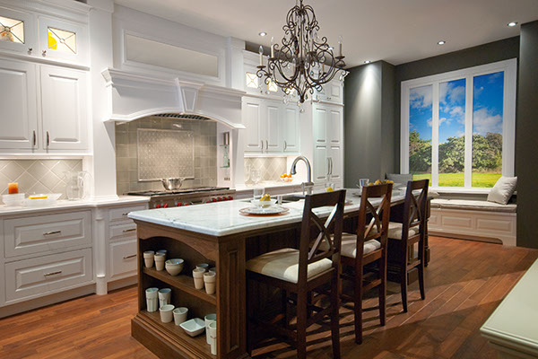 The kitchen was designed as a formal space that would also provide for many comforts an on-the-go family would appreciate. Clean, crisp lines accompany elegant and intricate detail. The woodwork details of the cabinets and vent hood are matched with the marble countertops of the kitchen island and the white quartz countertops located in the prep area.